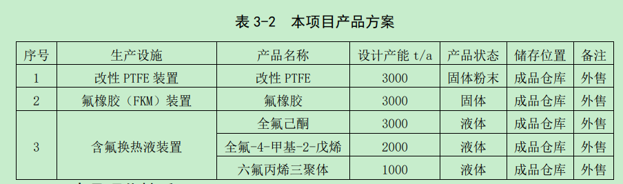 建设规模:3000吨/年改性聚四氟乙烯(PTFE)、3000吨/年氟橡胶和6000吨/年含 氟换热液(2000吨/年全氟-4-甲基-2-戊烯、1000吨/年六氟丙烯三聚体、3000吨/年全氟己酮